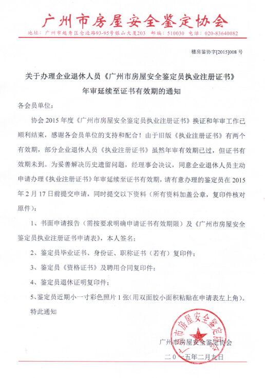 关于办理企业退休人员《广州市房屋安全鉴定员执业注册证书》(穗房鉴协字[2015]008号)