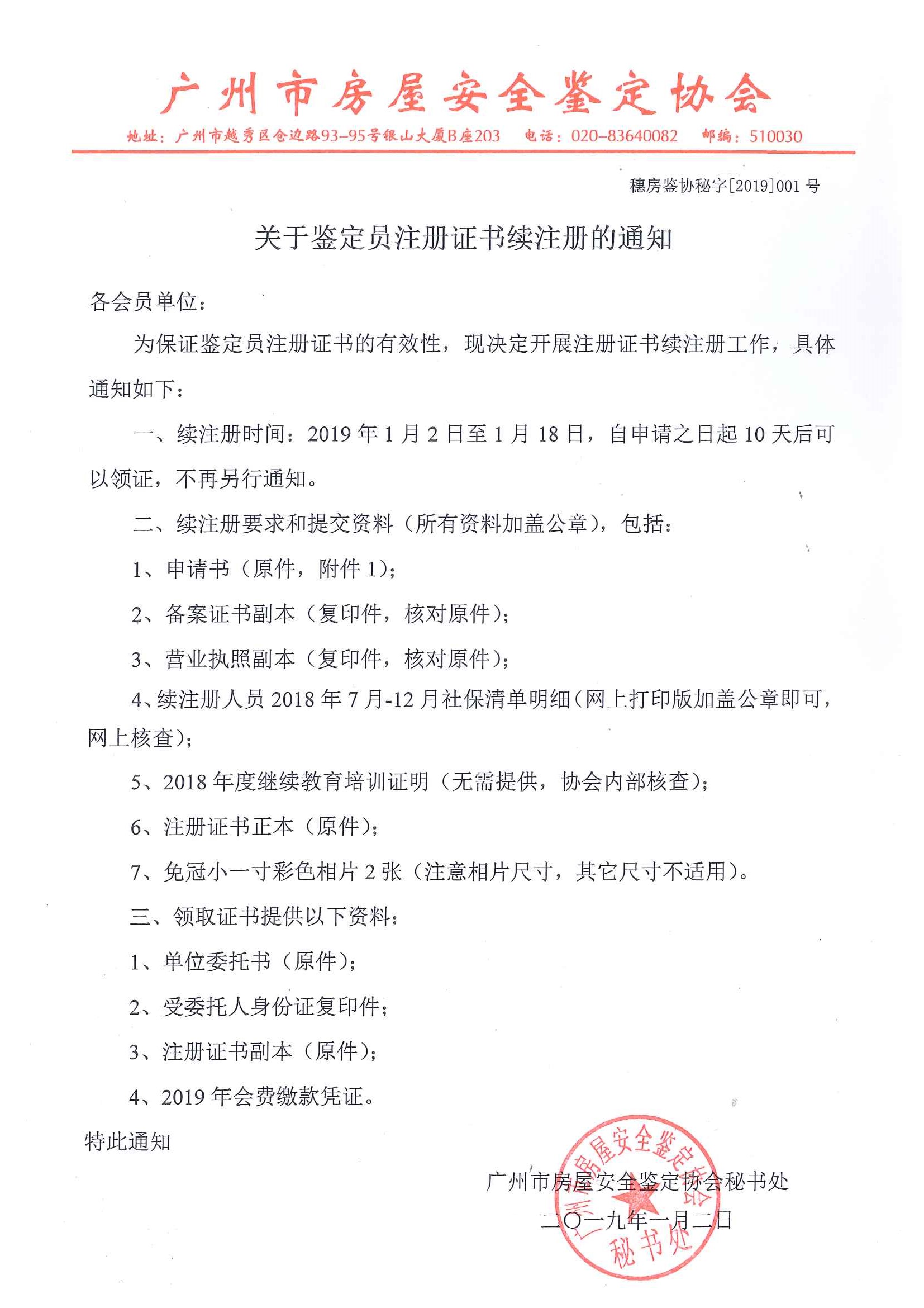 关于鉴定员注册证书续注册的通知(穗房鉴协秘字[2019]001号)