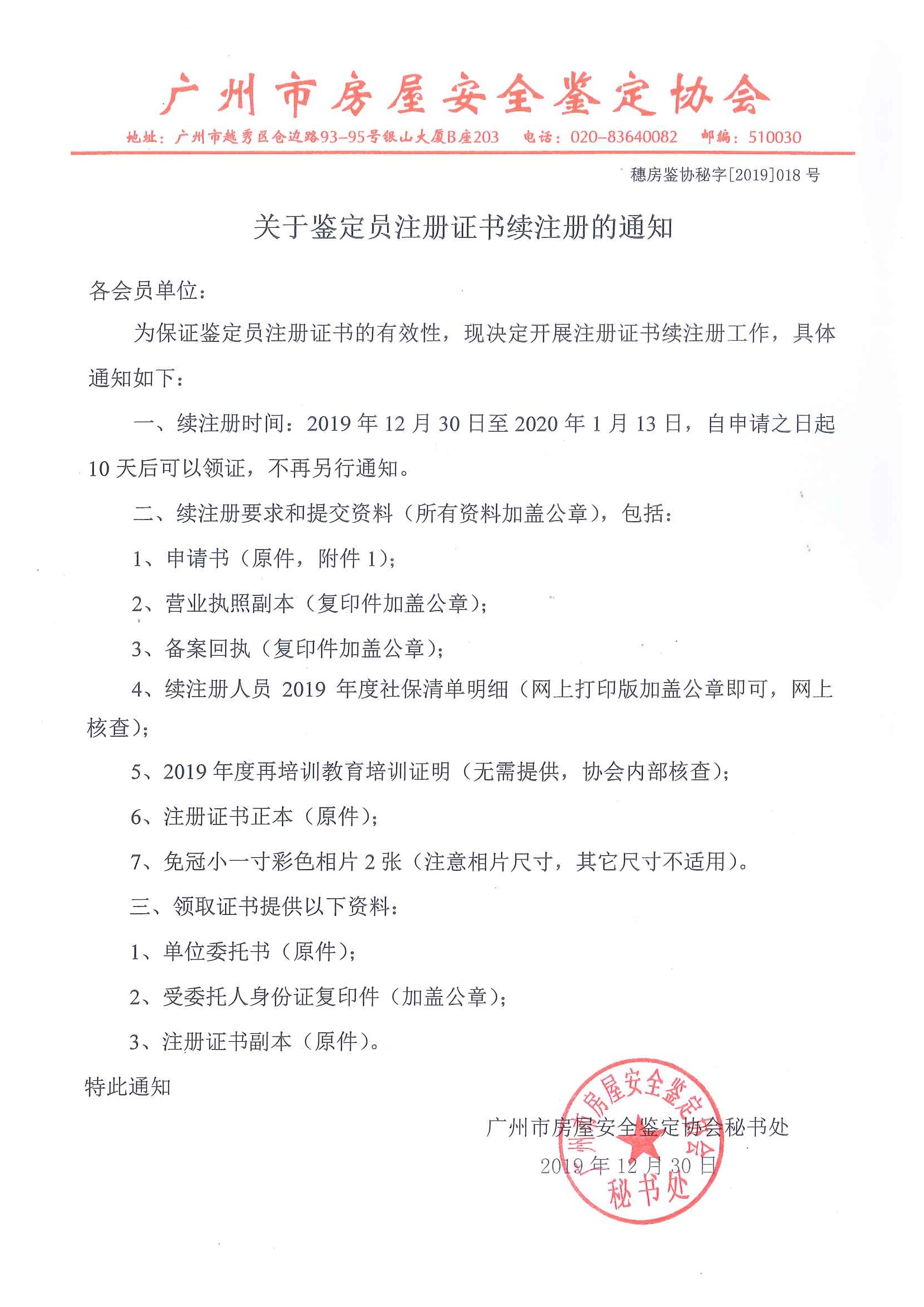 关于鉴定员注册证书续注册的通知(穗房鉴协秘字[2019]018号)