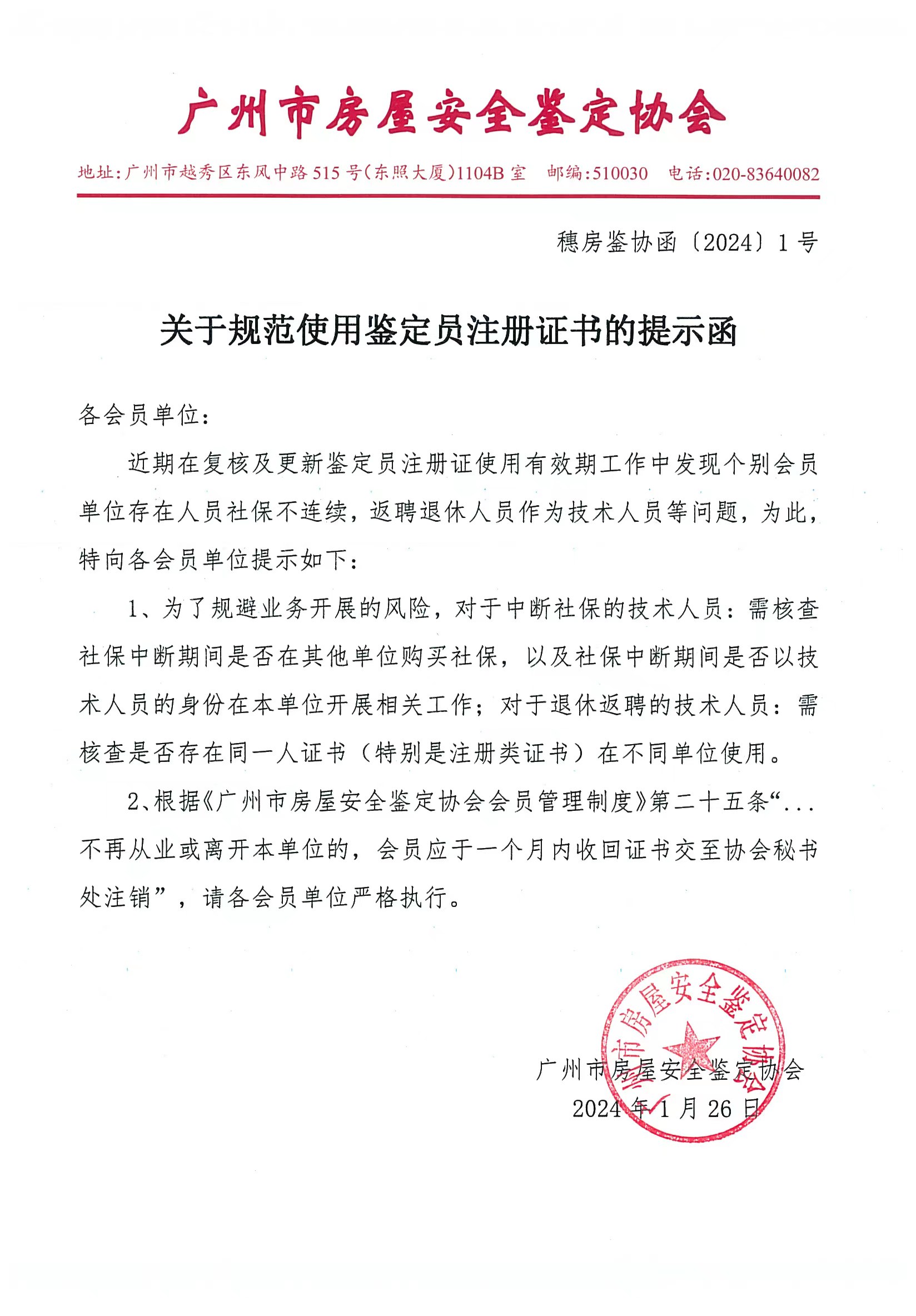 关于规范使用鉴定员注册证书的提示函(穗房鉴协函〔2024〕1号)