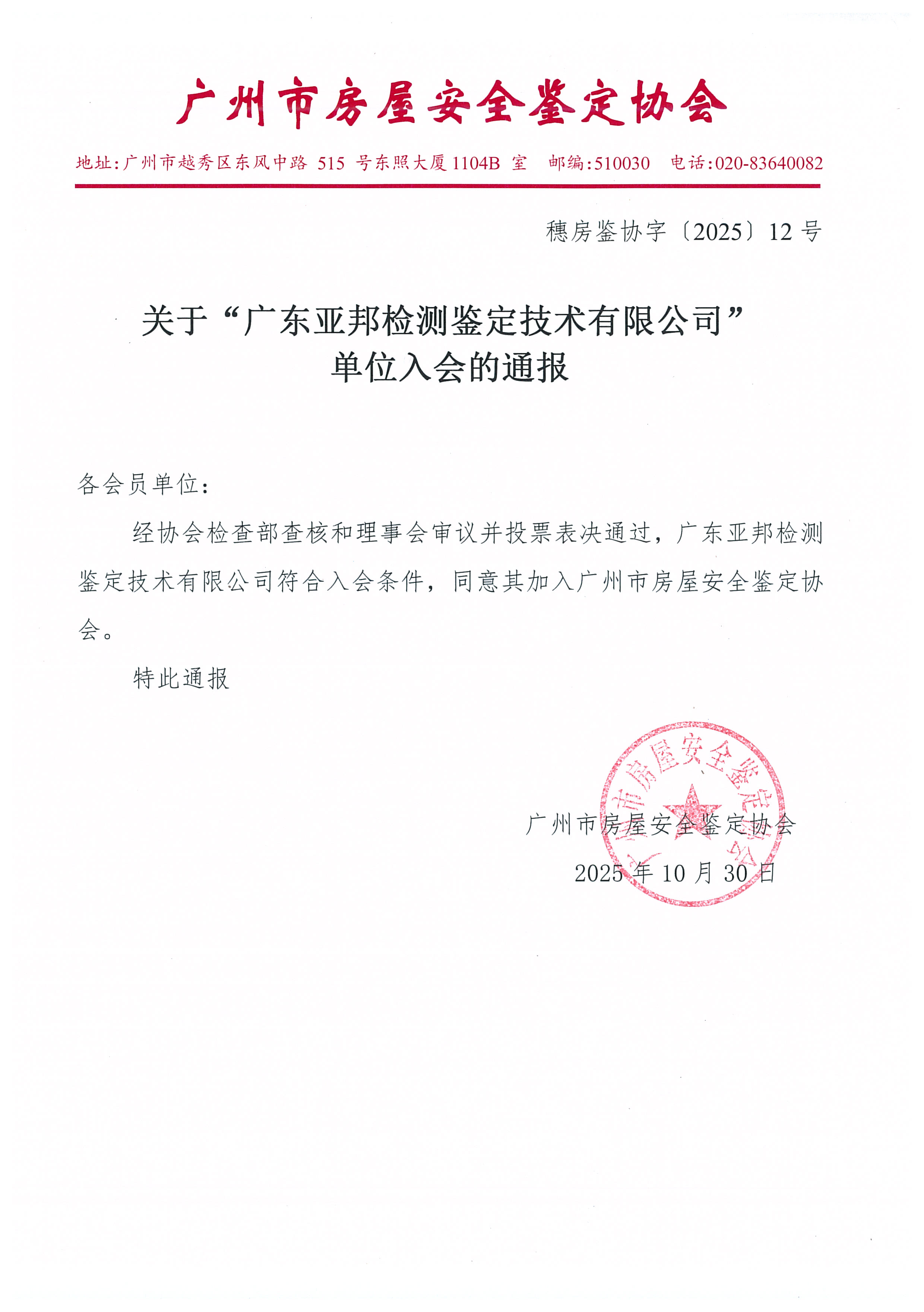 关于“广东亚邦检测鉴定技术有限公司”单位入会的通报(穗房鉴协字〔2025〕12号)