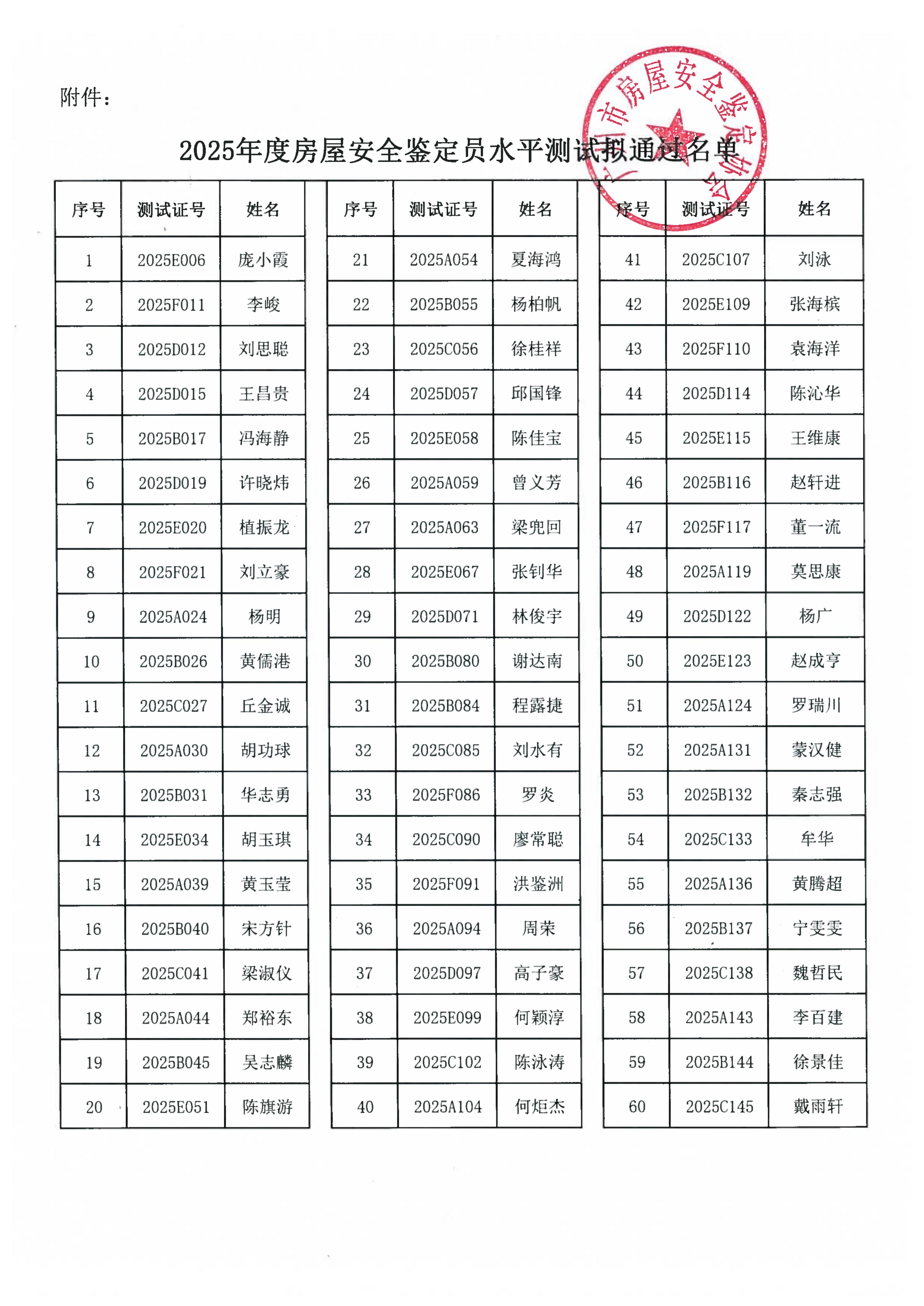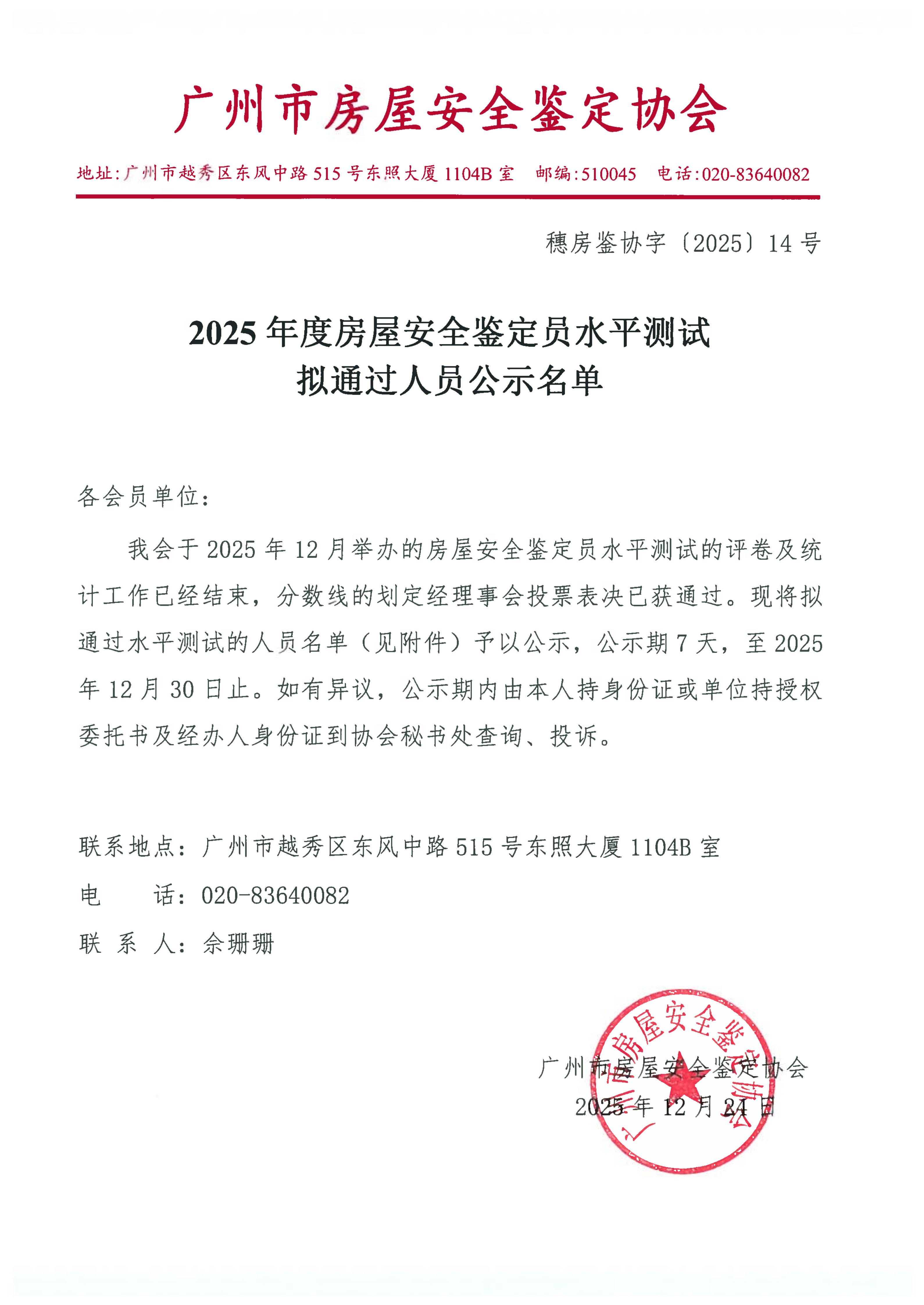 2025年度房屋安全鉴定员水平测试拟通过人员公示名单(穗房鉴协字〔2025〕14号)