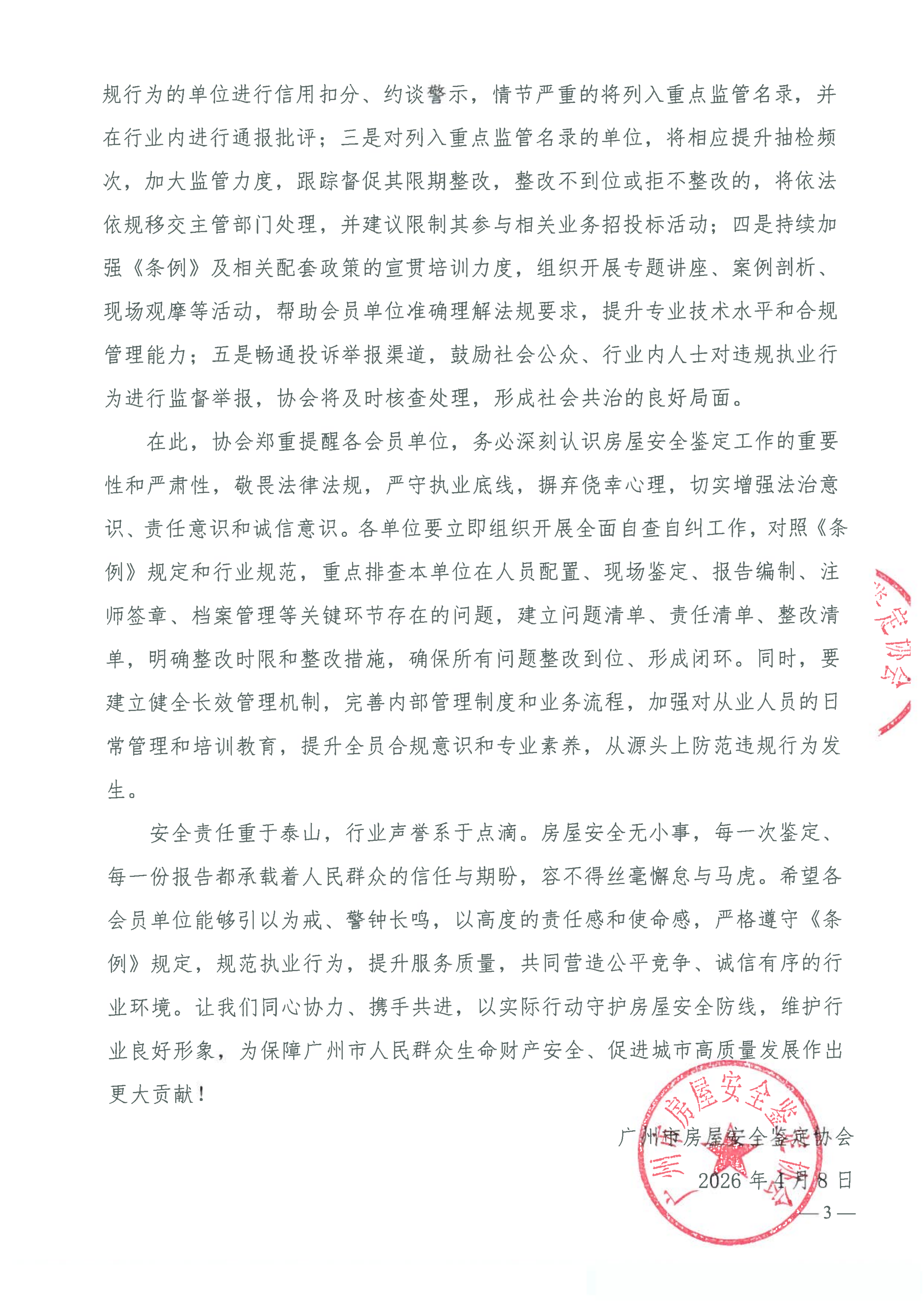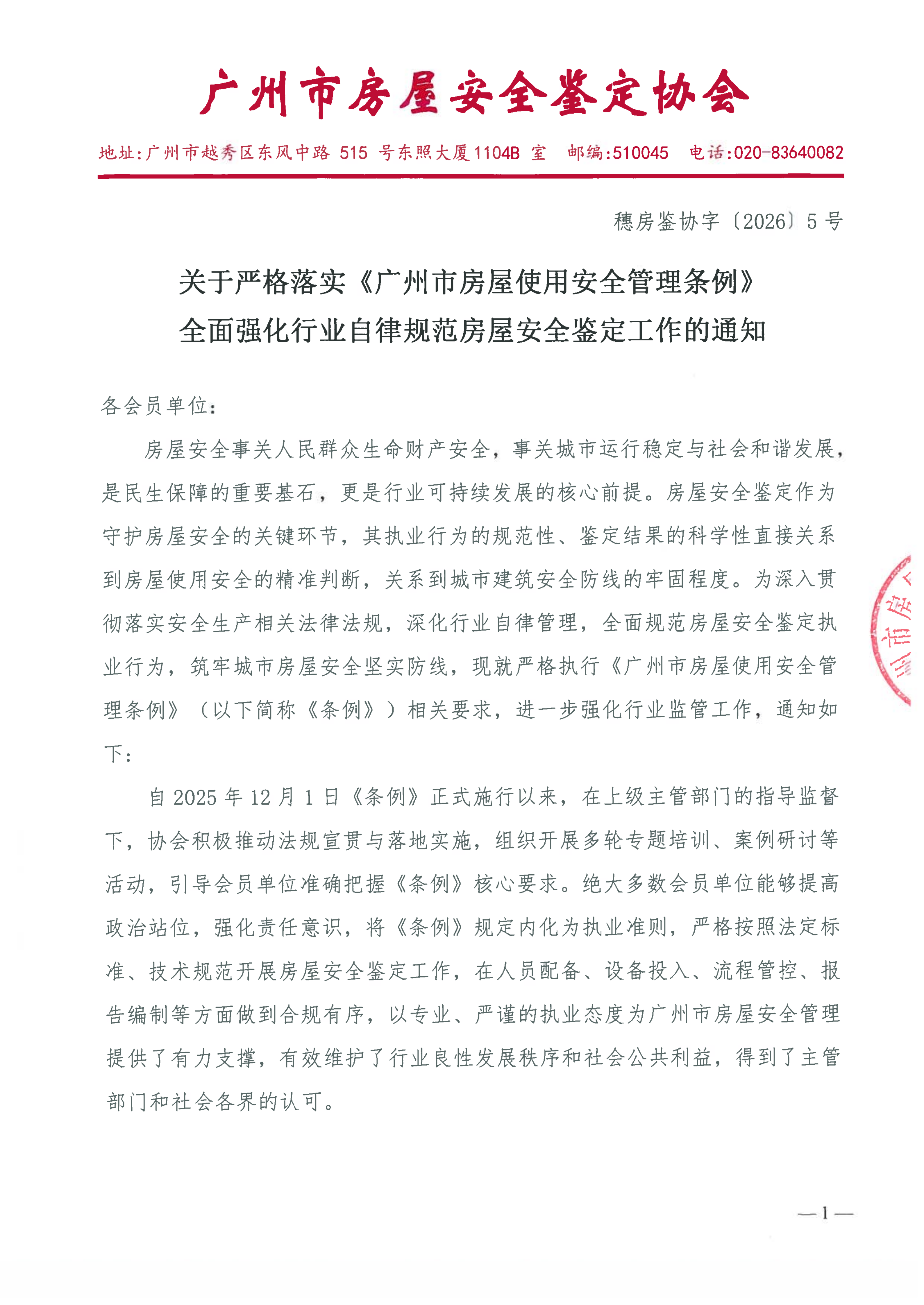 关于严格落实《广州市房屋使用安全管理条例》全面强化行业自律规范房屋安全鉴定工作的通知(穗房鉴协字〔2026〕5号)